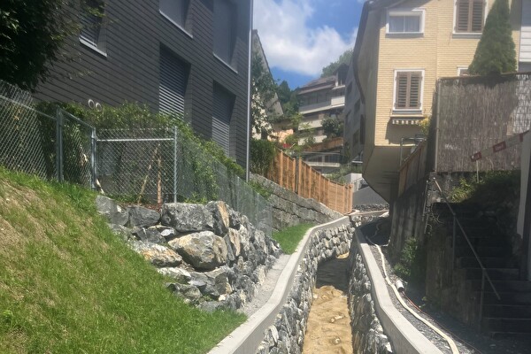Nach rund fünf Monaten Bauzeit sind die Hauptarbeiten zur Offenlegung des Dorfbachs abgeschlossen. Im Abschnitt Gütschweg wurde der Bach auf einer Länge von etwa 65 Metern offengelegt und in einem Blocksteingerinne naturnah ausgebaut.